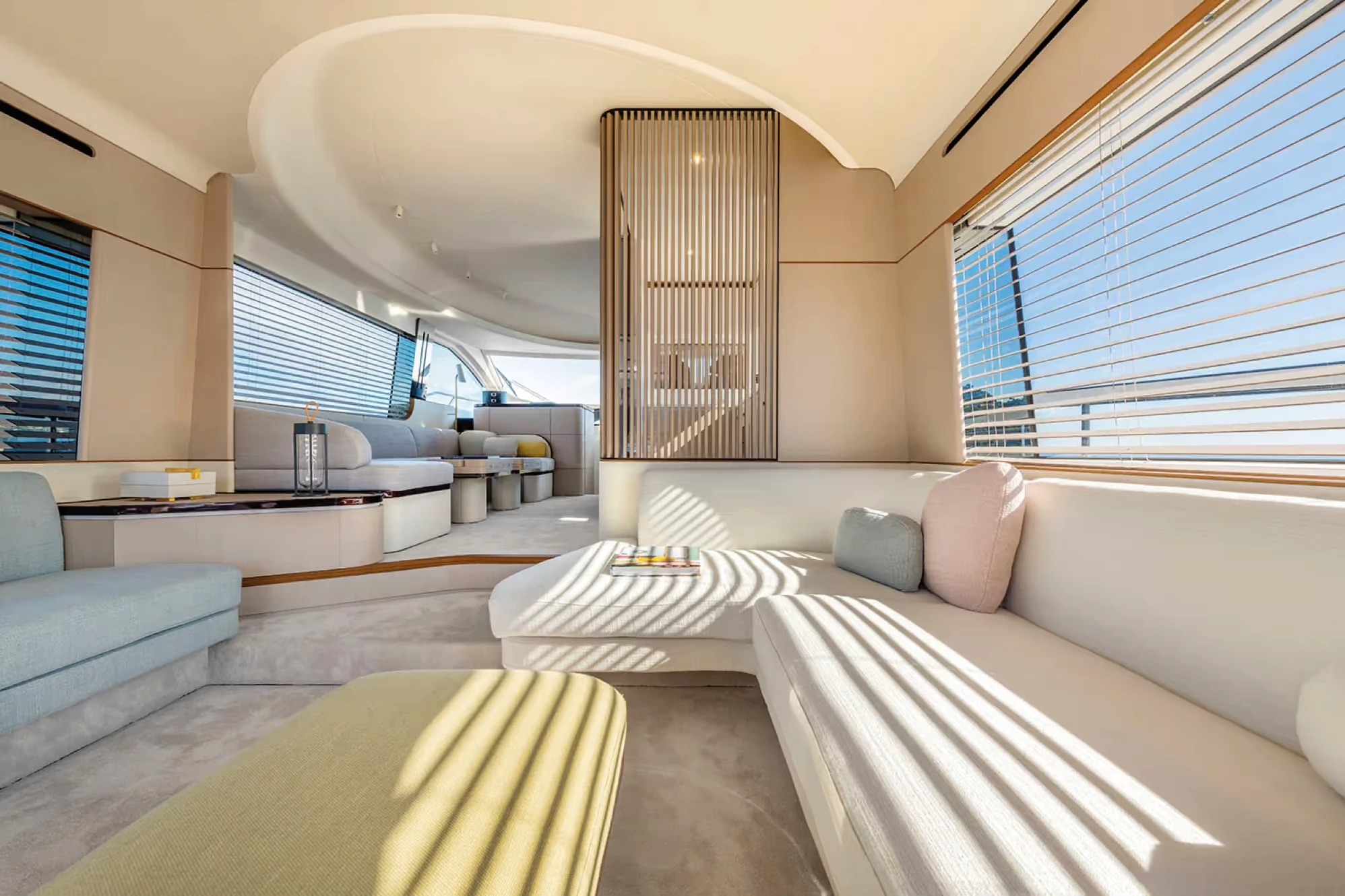 Step aboard and the interior unfolds like a gallery of modern Italian living. The layout is flexible, with three distinct main deck configurations that cater to different moods—whether you prefer the openness of a loft-style galley or the intimacy of a semi-enclosed dining space. Materials are layered with intention: ribbed woods, soft textiles, and ambient lighting create a tactile warmth that invites you to linger. It’s not just about luxury—it’s about atmosphere.