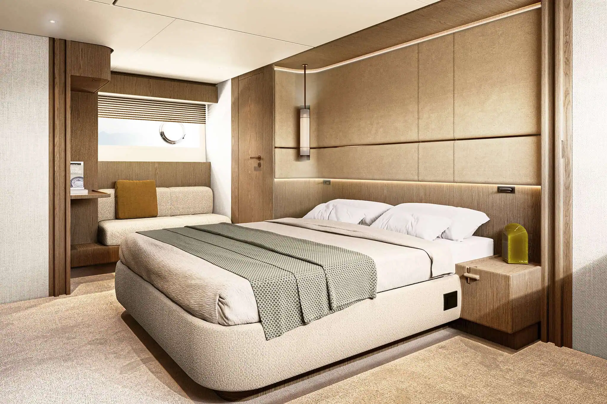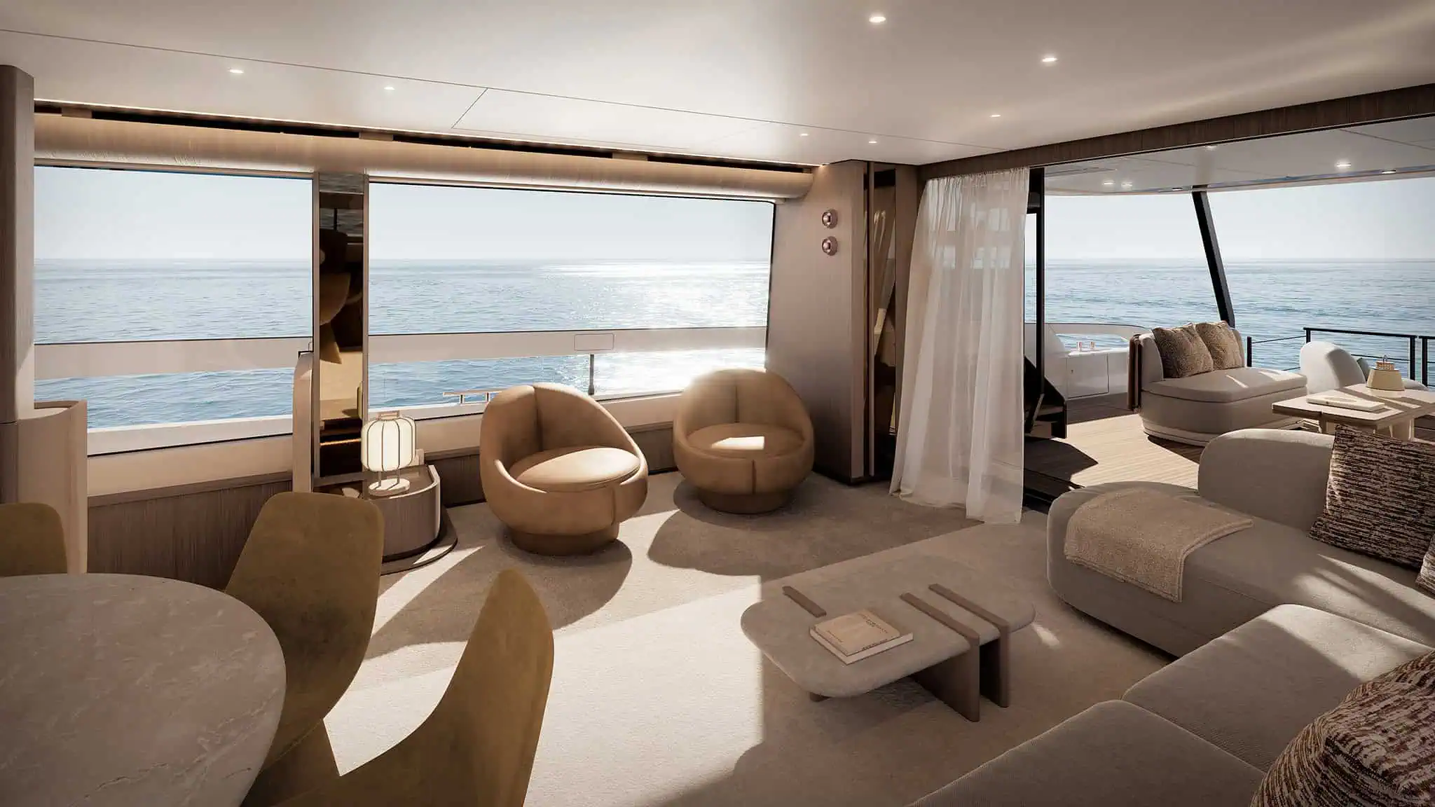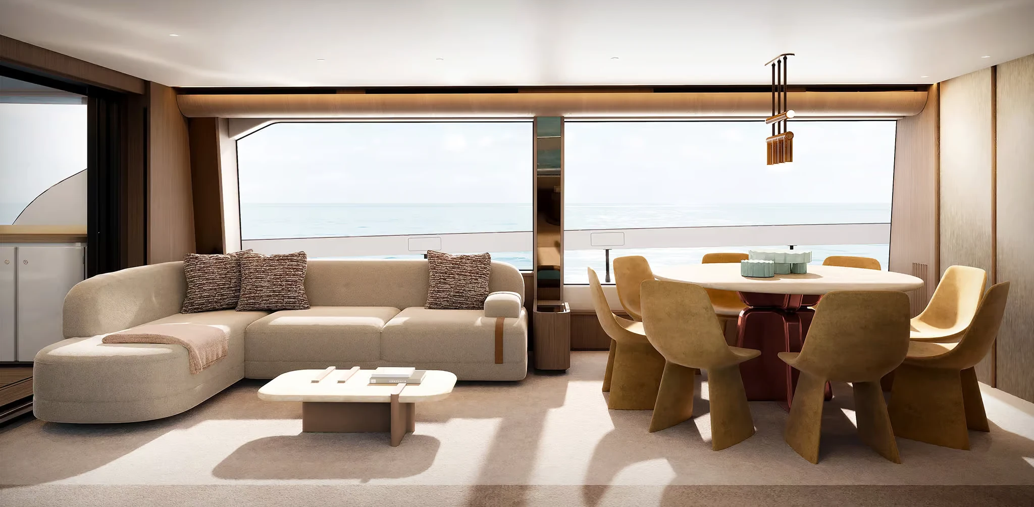 • Interior revolves around a generous round dining table for convivial saloon layout.