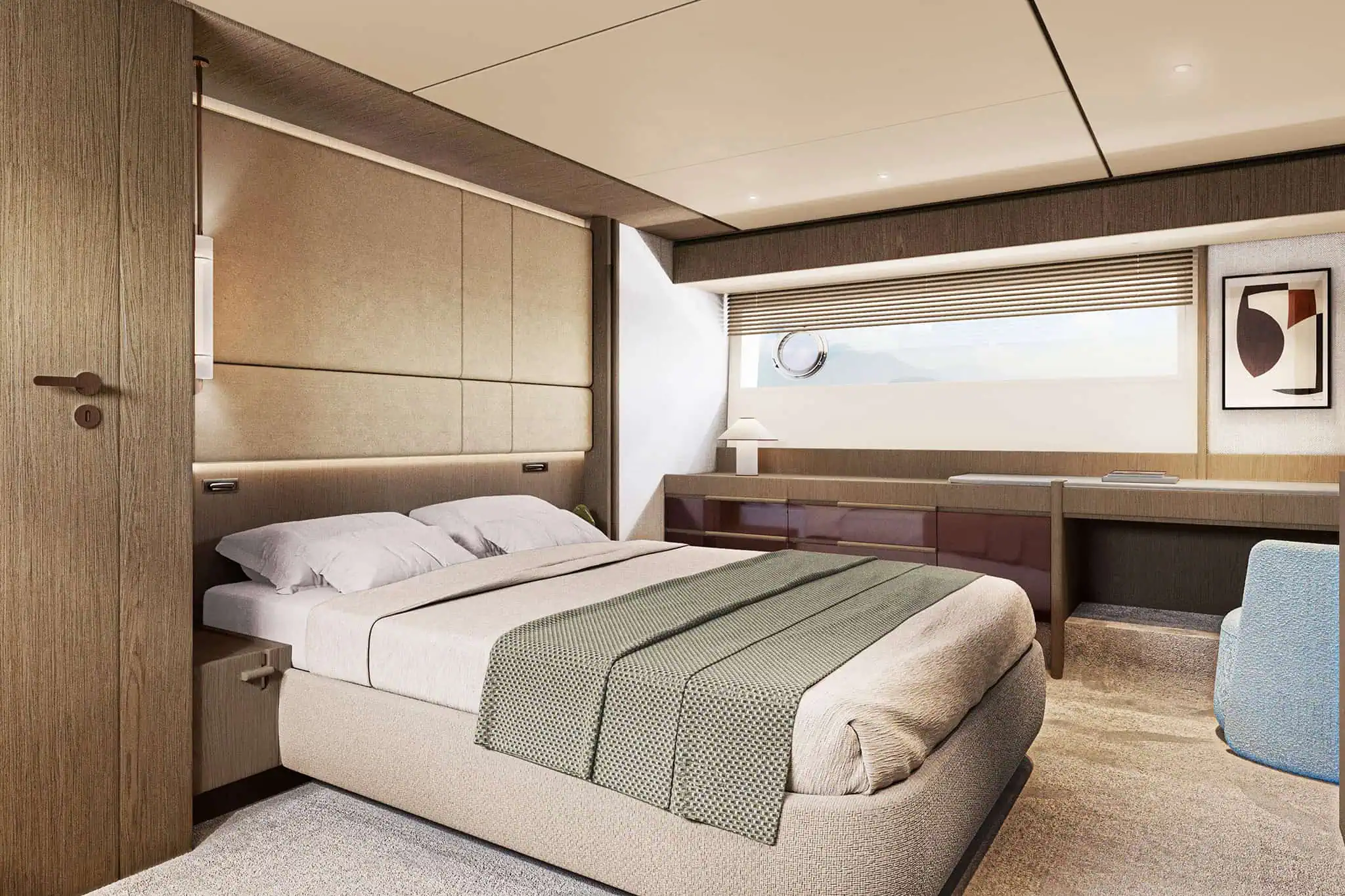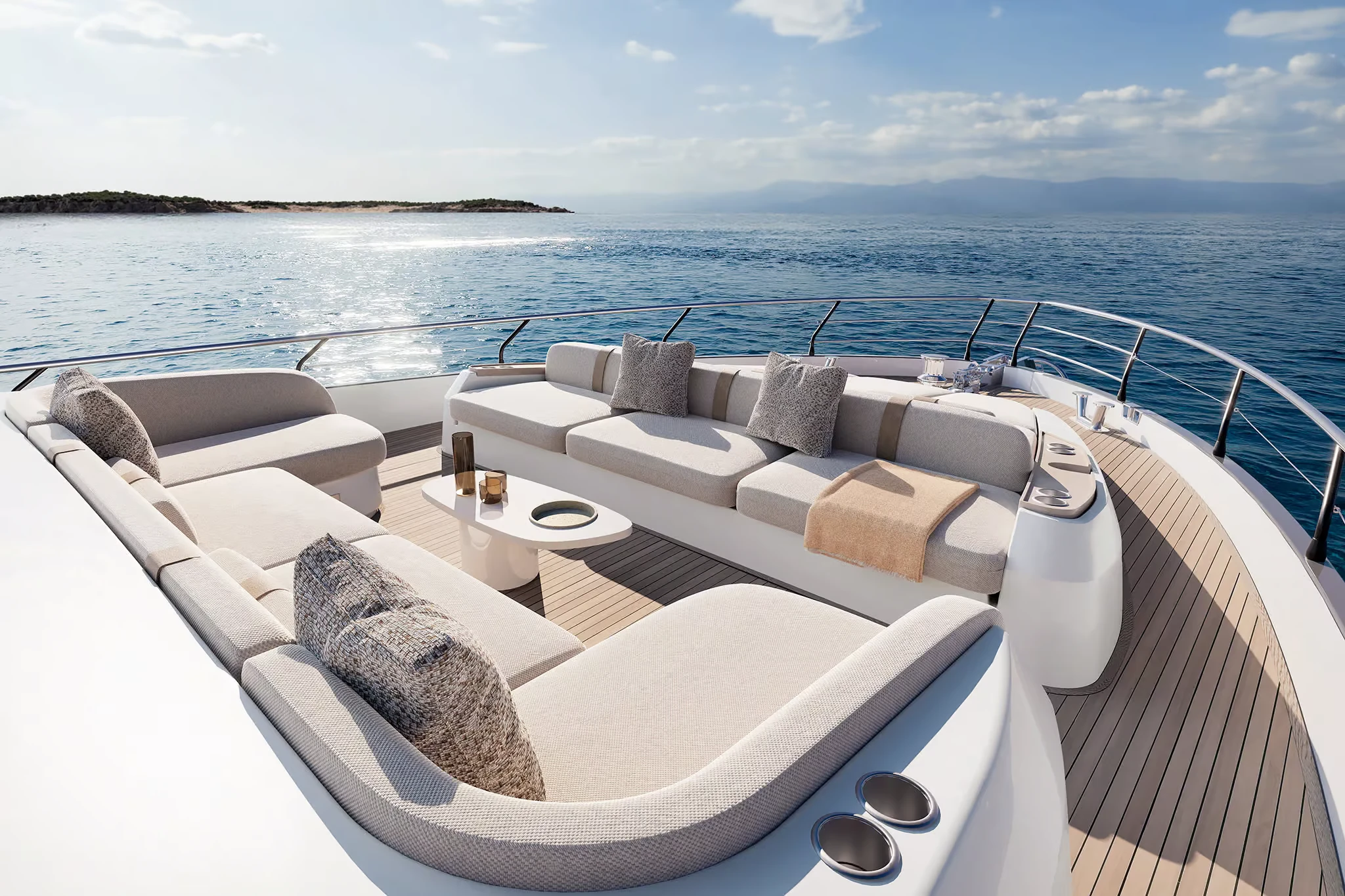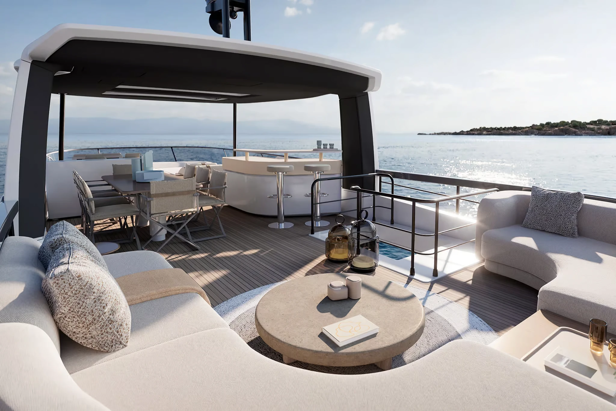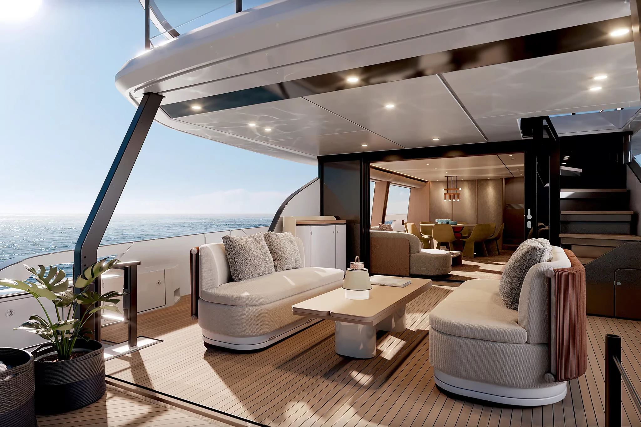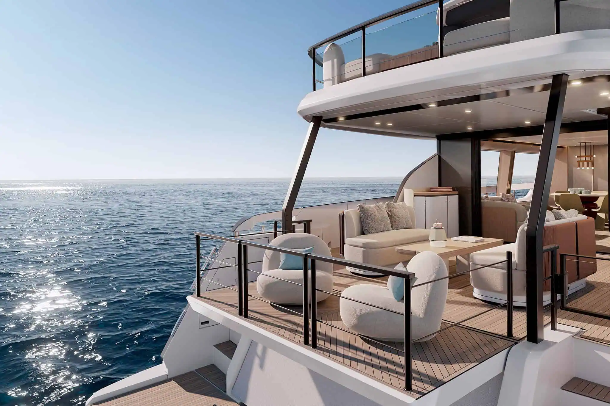 • Incorporates Deck2Deck™ terrace system: an opening transom rises to align with the aft edge of the main deck, expanding the cockpit into a terrace at water’s edge.