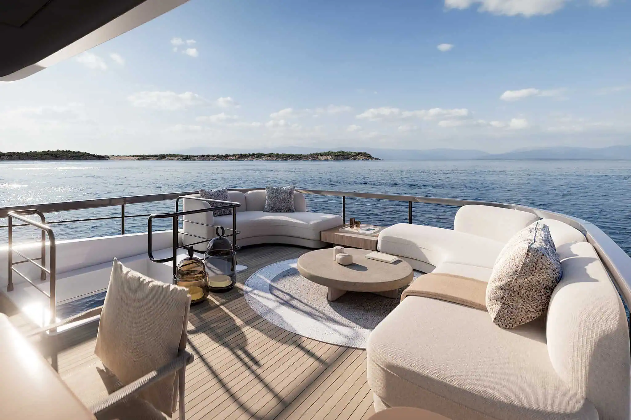 The yacht’s functionality is equally impressive. Four spacious guest cabins provide comfort and privacy, complemented by dedicated crew quarters that ensure seamless service. The innovative Deck2Deck™ terrace system transforms the aft area into a waterfront lounge, rising to align with the main deck for a dramatic expansion of space. This creates a natural connection to the sea, whether for relaxed mornings with coffee or lively evening gatherings.