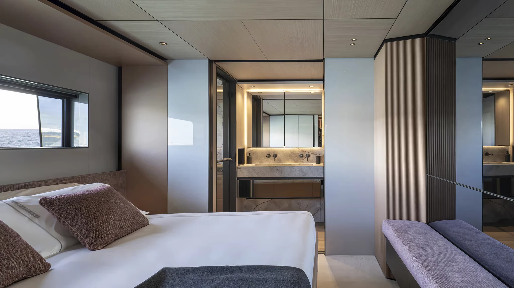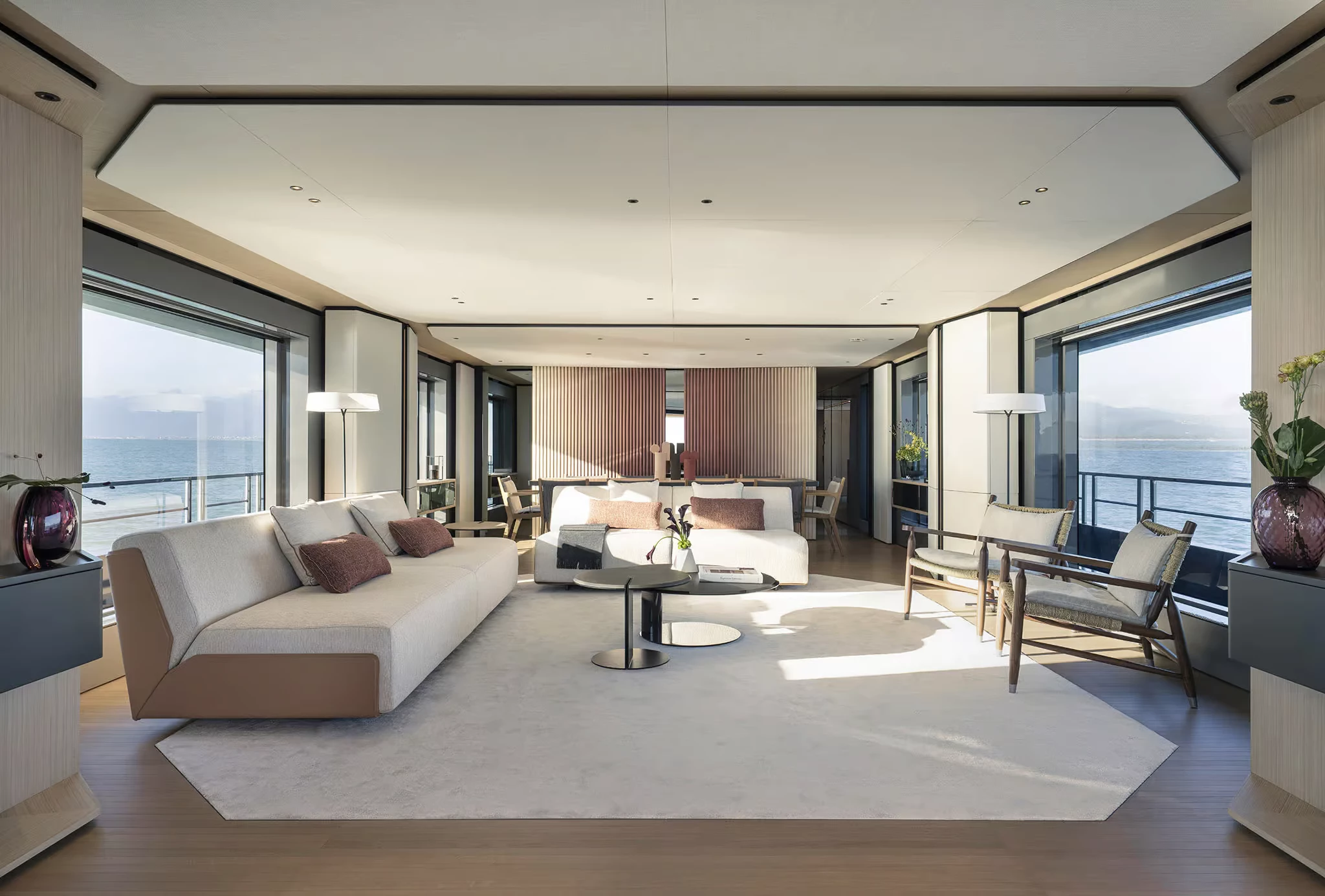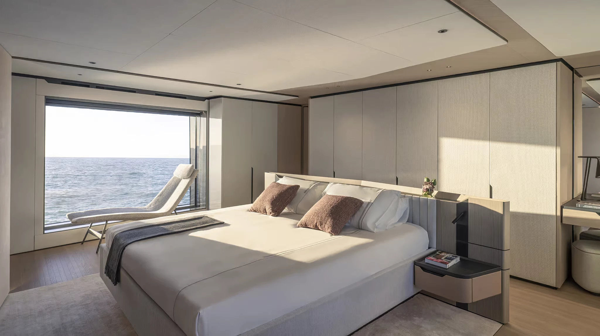 Alberto Mancini’s exterior design highlights long, uninterrupted lines, sculptural surfaces, and large glass panels. One of her standout innovations is the semi-walkaround upper deck that runs flush from stern to near bow, giving guests unprecedented freedom of movement. This is enhanced further by fully retractable side windows linking the skylounge and aft terrace, effectively dissolving the barrier between inside and out.