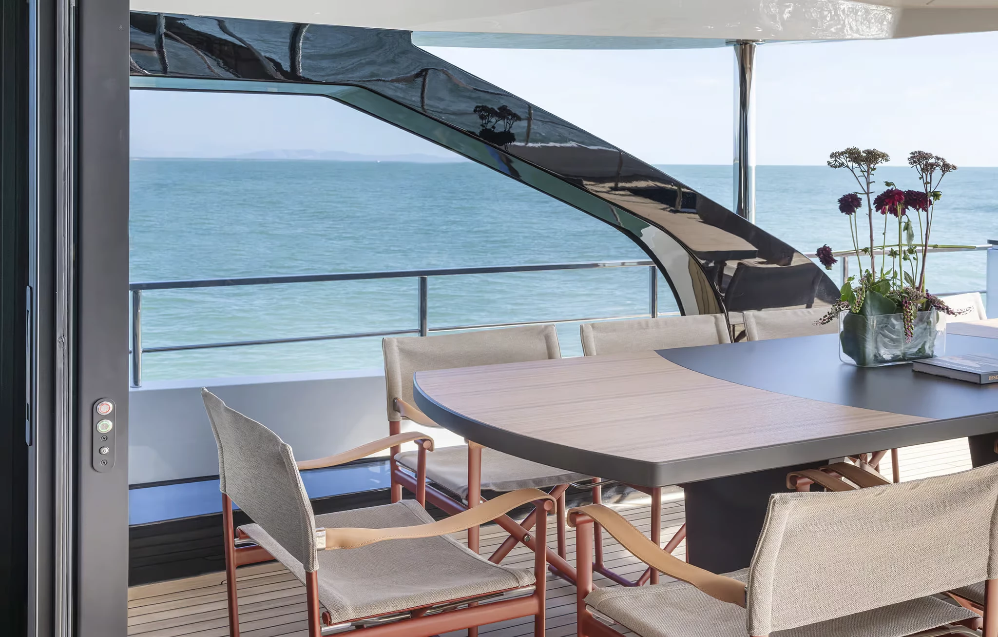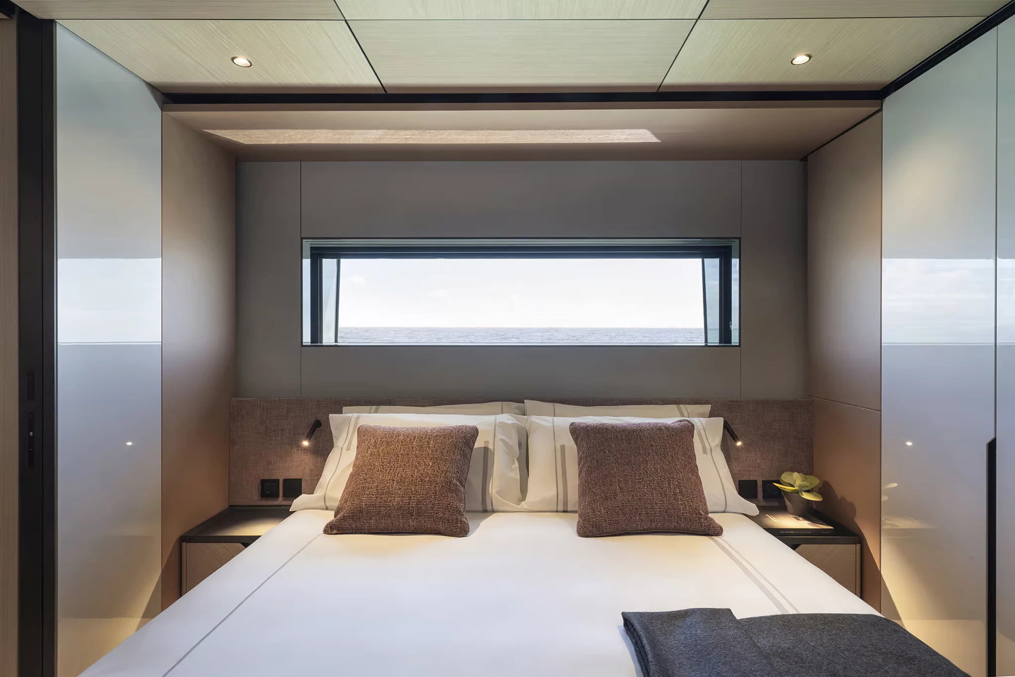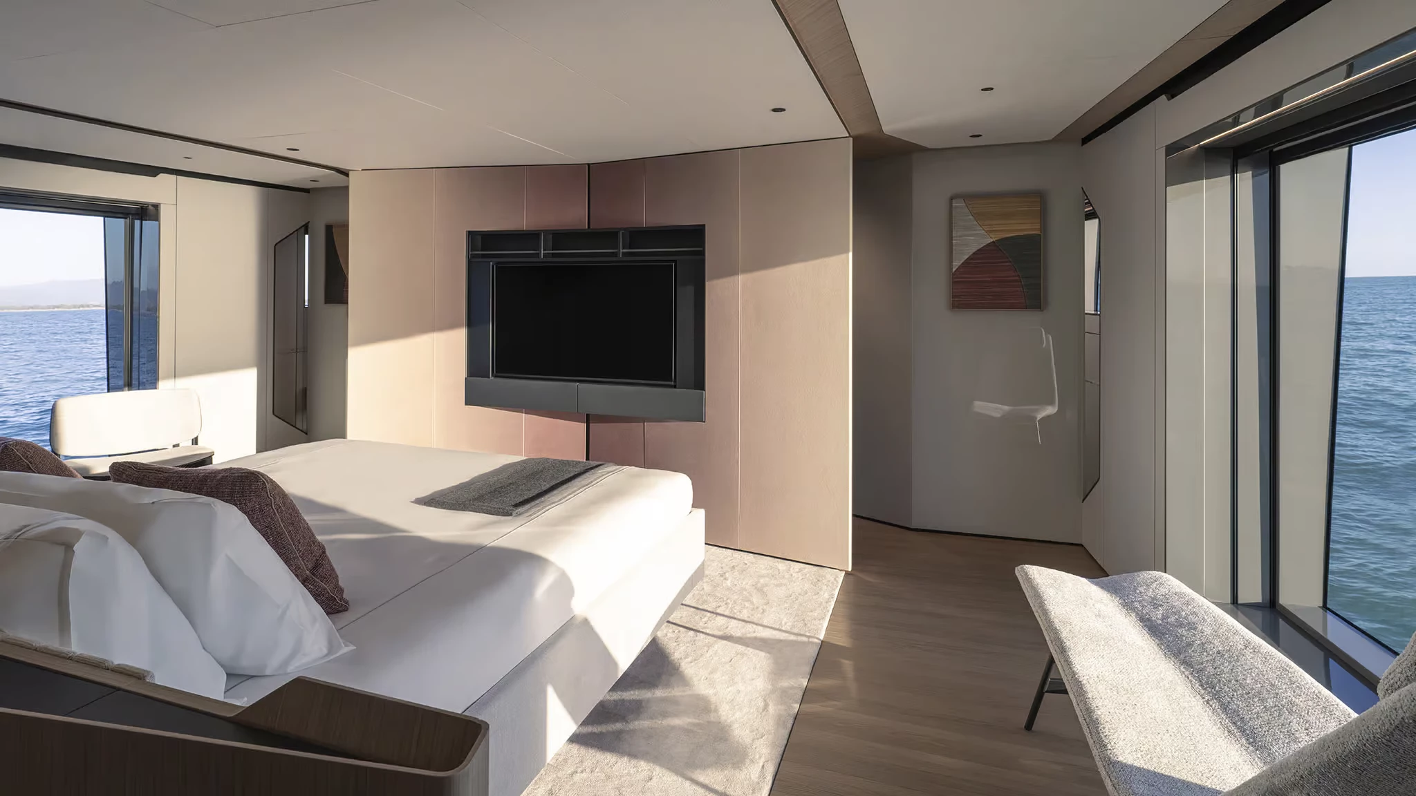 Alberto Mancini’s exterior design highlights long, uninterrupted lines, sculptural surfaces, and large glass panels. One of her standout innovations is the semi-walkaround upper deck that runs flush from stern to near bow, giving guests unprecedented freedom of movement. This is enhanced further by fully retractable side windows linking the skylounge and aft terrace, effectively dissolving the barrier between inside and out.