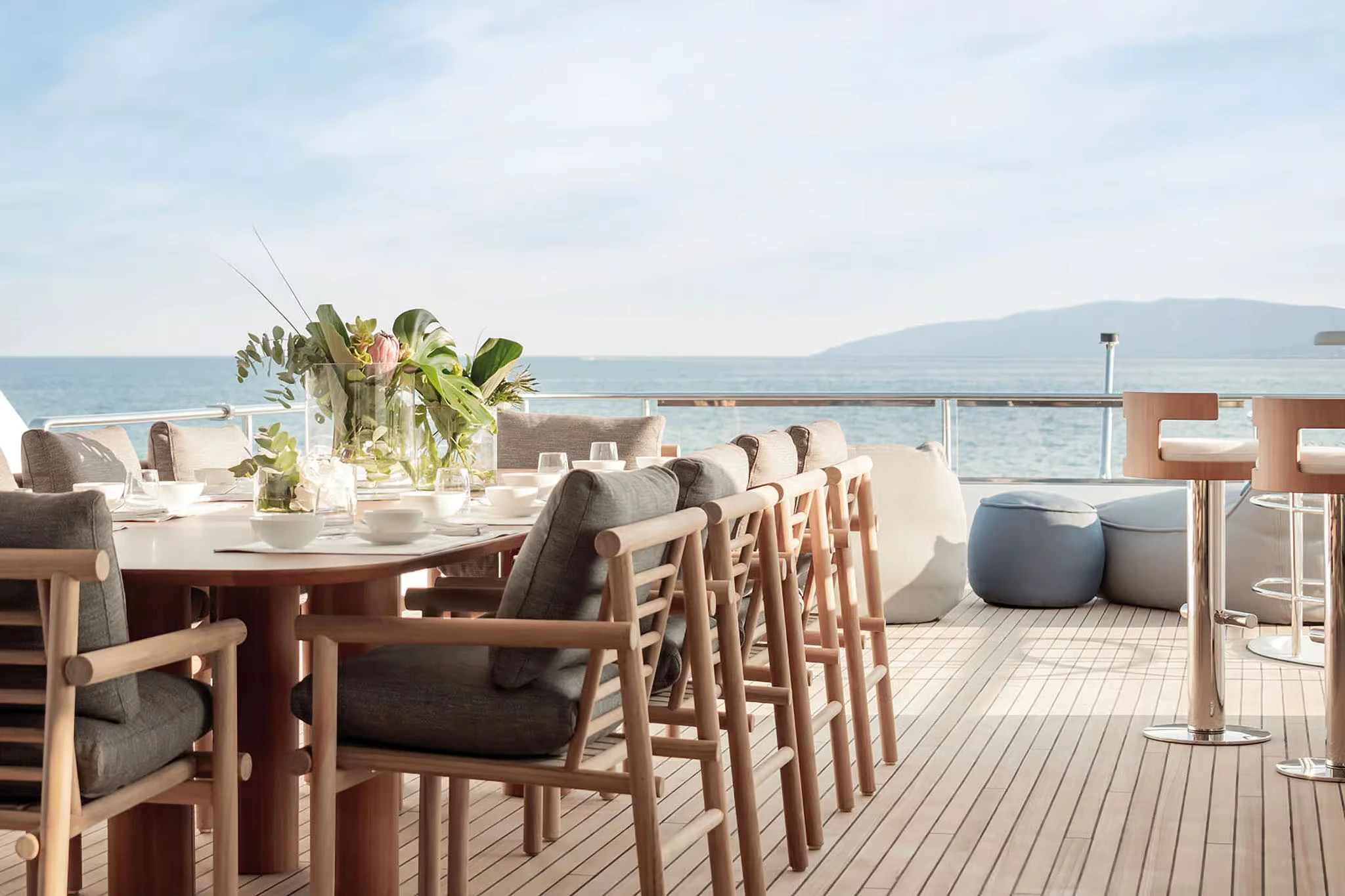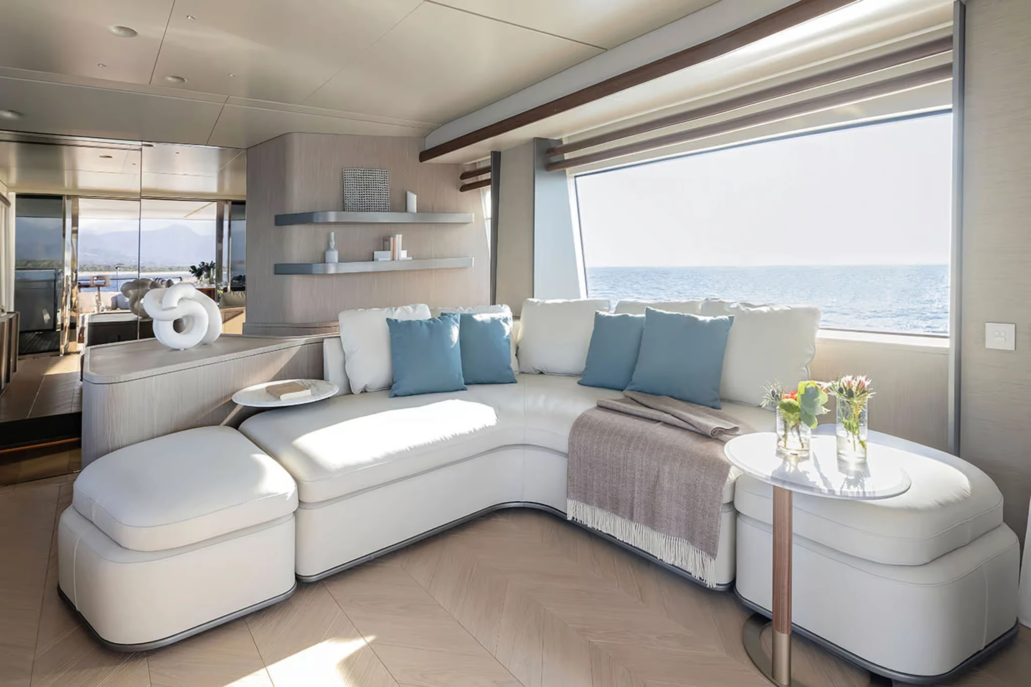 On deck, multiple relaxation and entertainment areas are thoughtfully arranged: an expansive flybridge for dining and sunbathing, a foredeck lounge with adaptable seating, and a beach club with a hydraulic swim platform and tender garage. Each area has been designed with the same balance of functionality and elegance that defines the yacht as a whole.