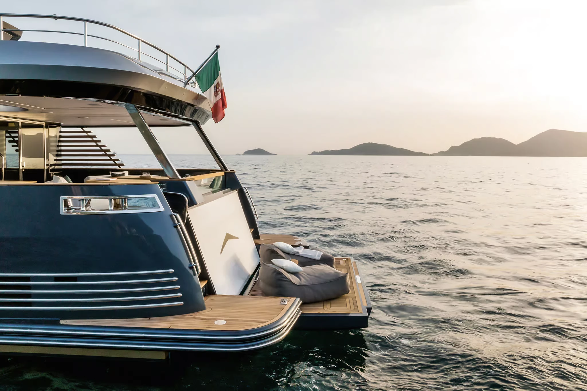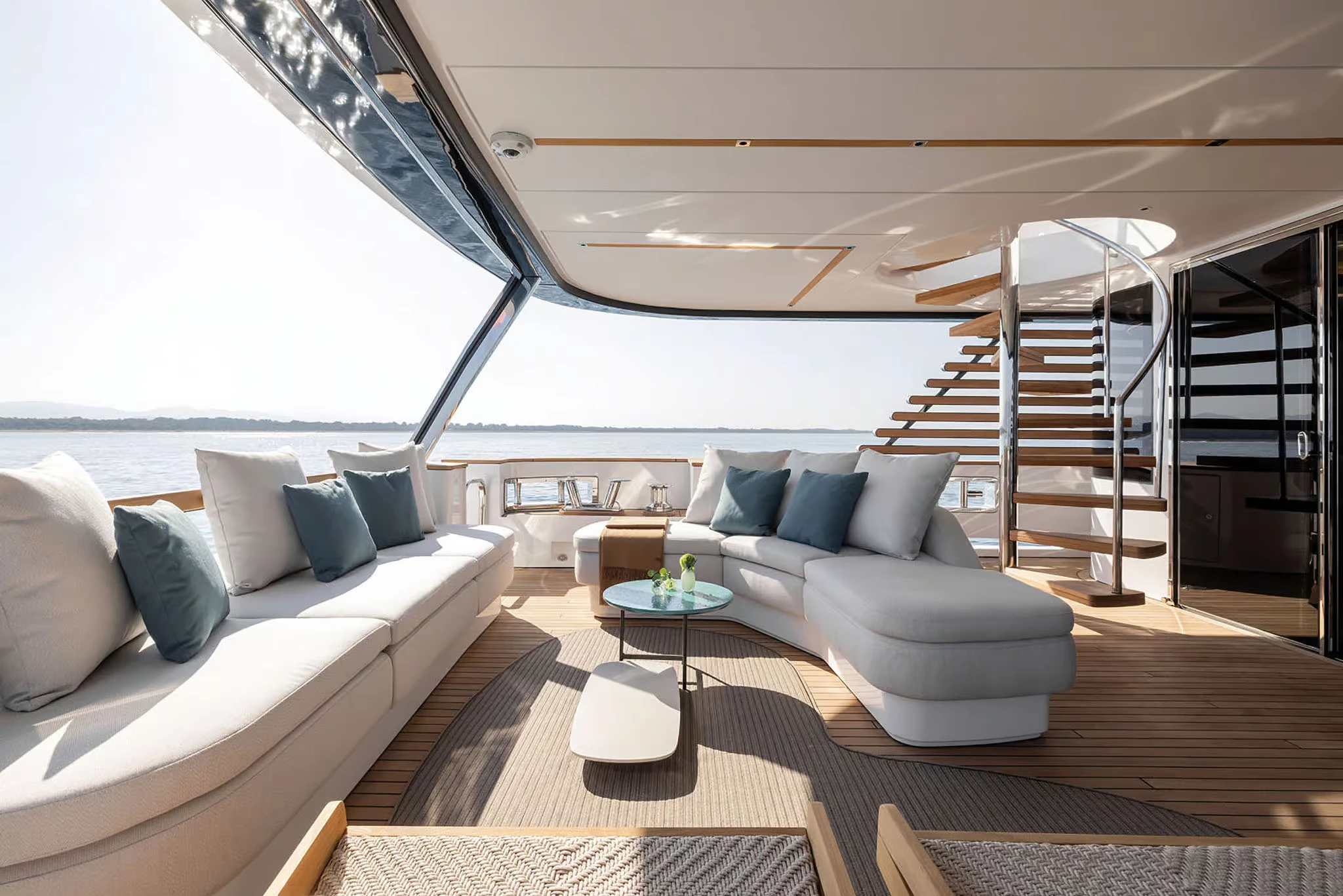 | Decks & Exterior | Expansive glazed surfaces & panoramic windows; flybridge, foredeck lounge, tender garage and large swim/beach platform (hydraulic in some versions) |
