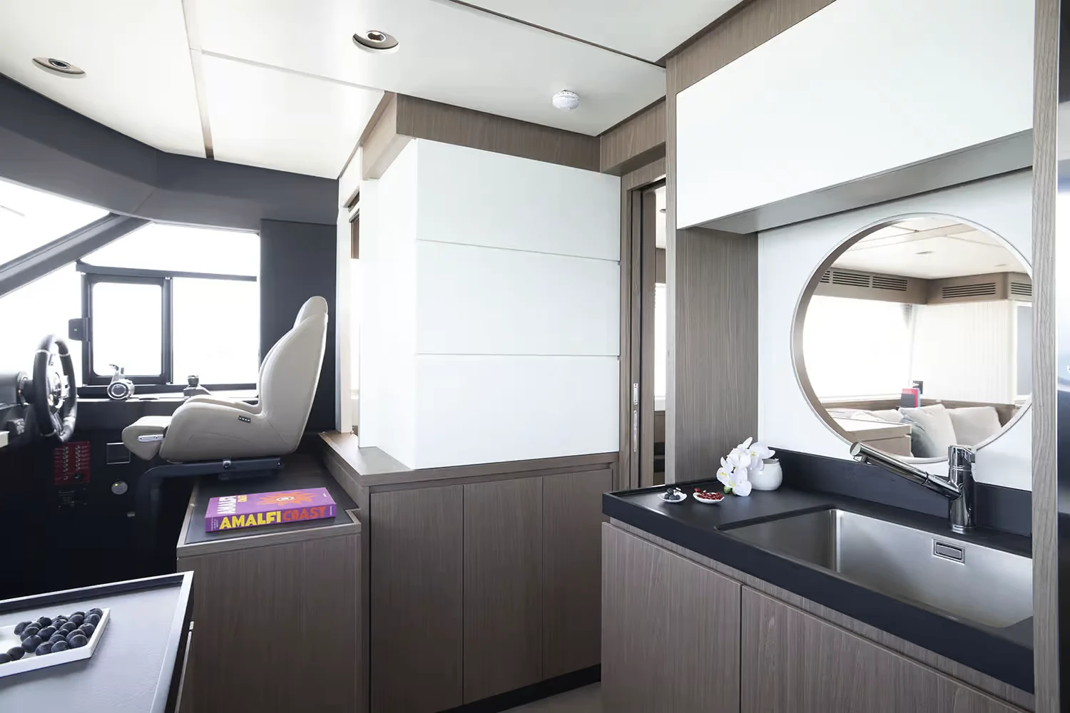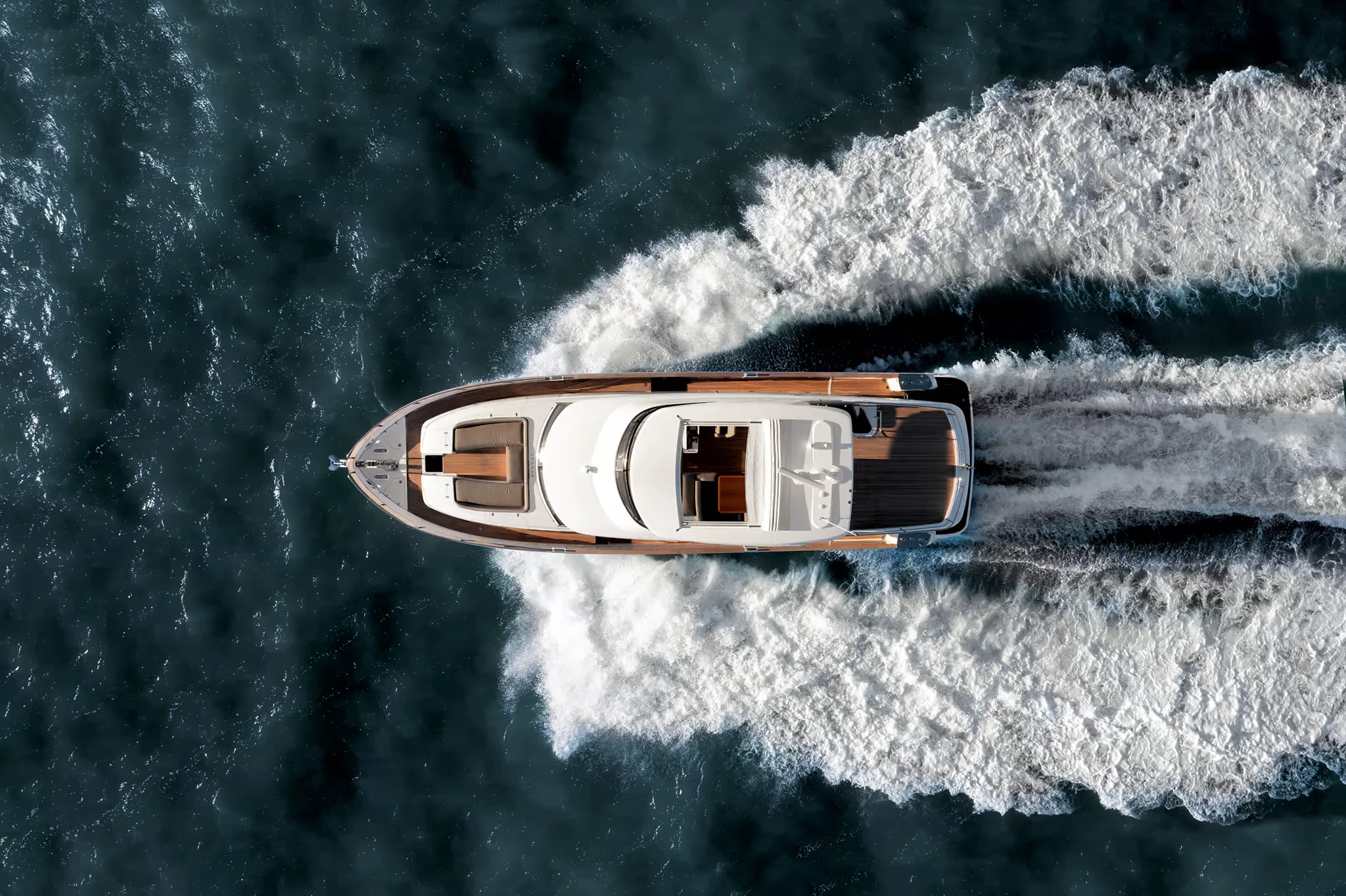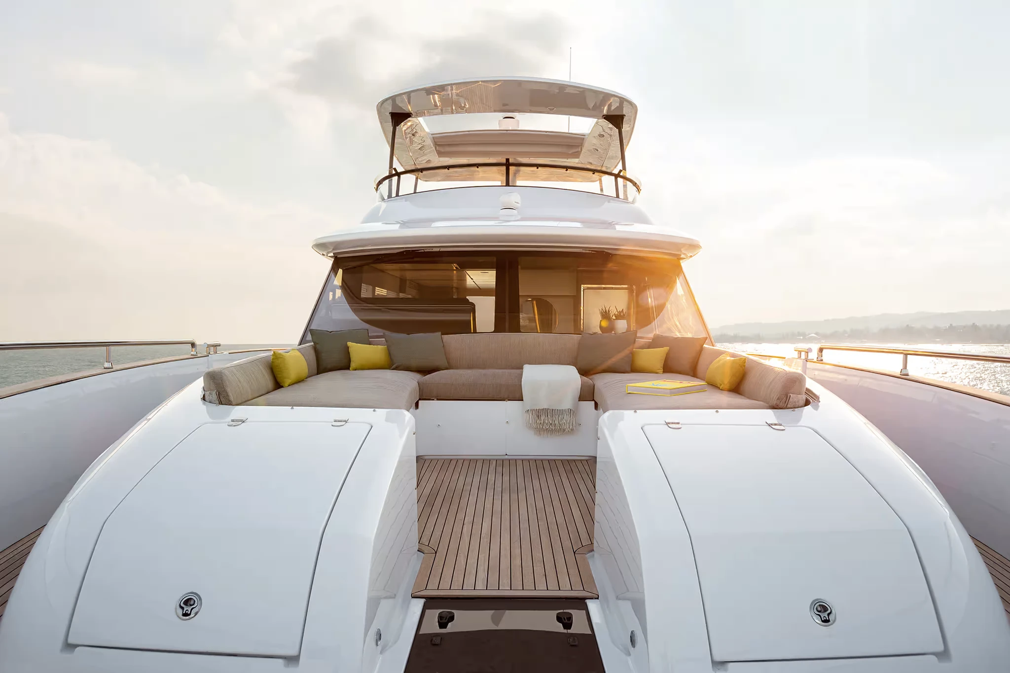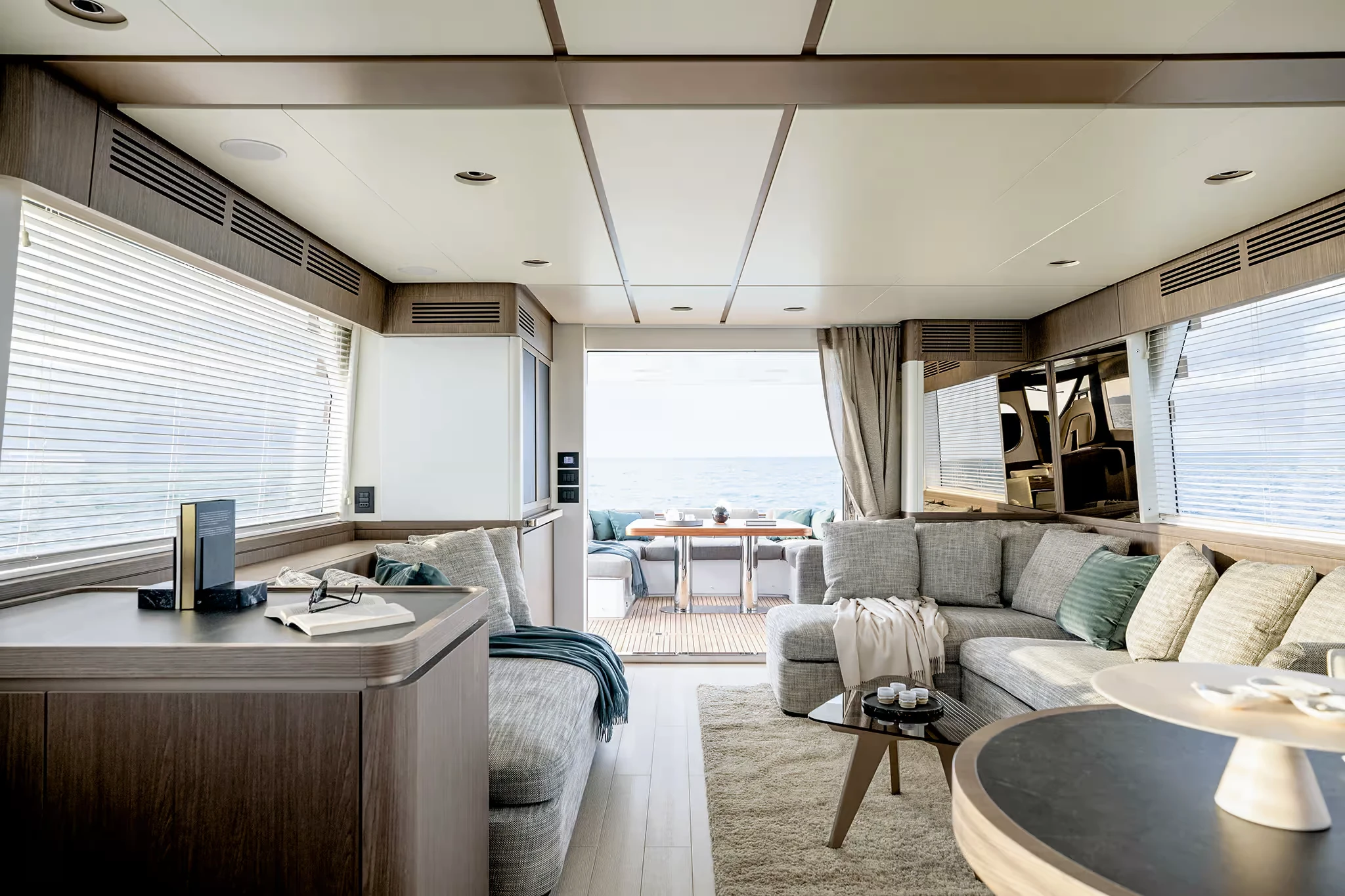 From the exterior, the yacht presents balanced proportions and strong lines, with broad glazing that emphasizes connection to the sea. On deck, the design creates multiple spaces for relaxation and social life. The flybridge is a generous platform with dining, lounging, and sunbathing areas, shaded by a hardtop that can be equipped with an opening section. At the bow, a U-shaped lounge with a table provides a private place to enjoy the view, while the aft cockpit opens directly to the salon for seamless indoor-outdoor living.