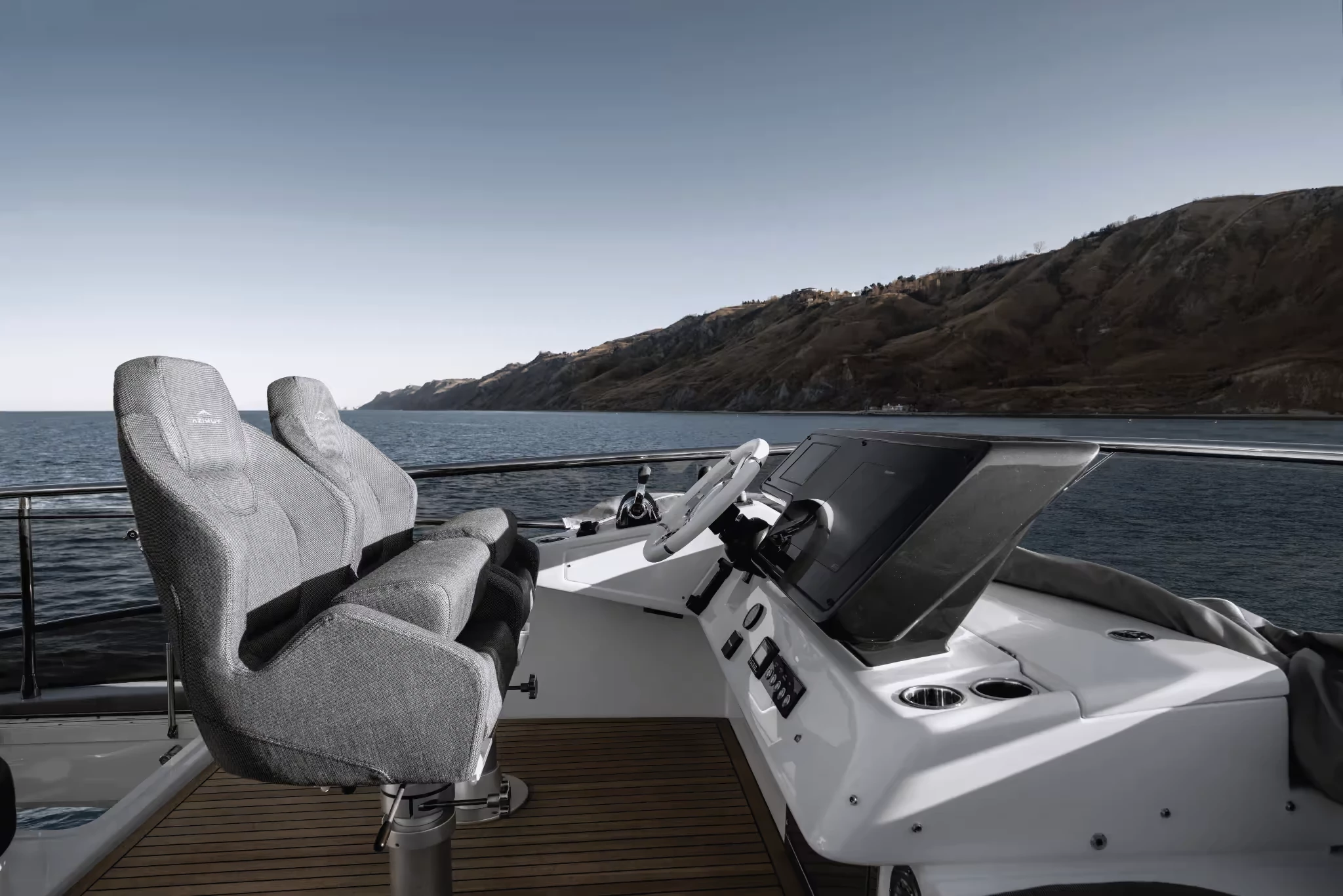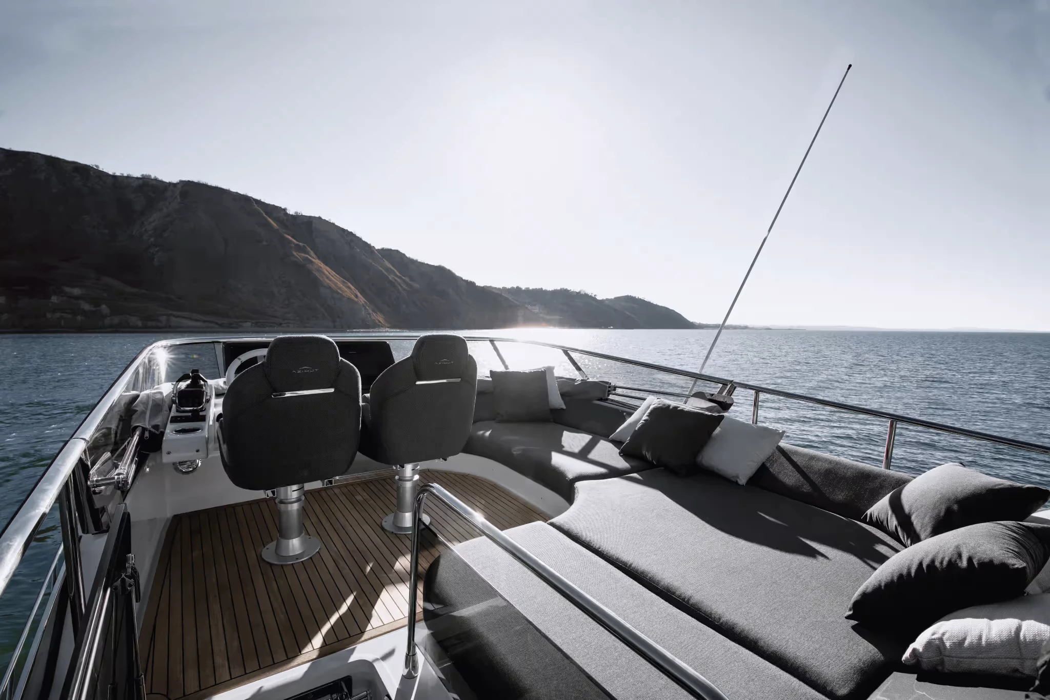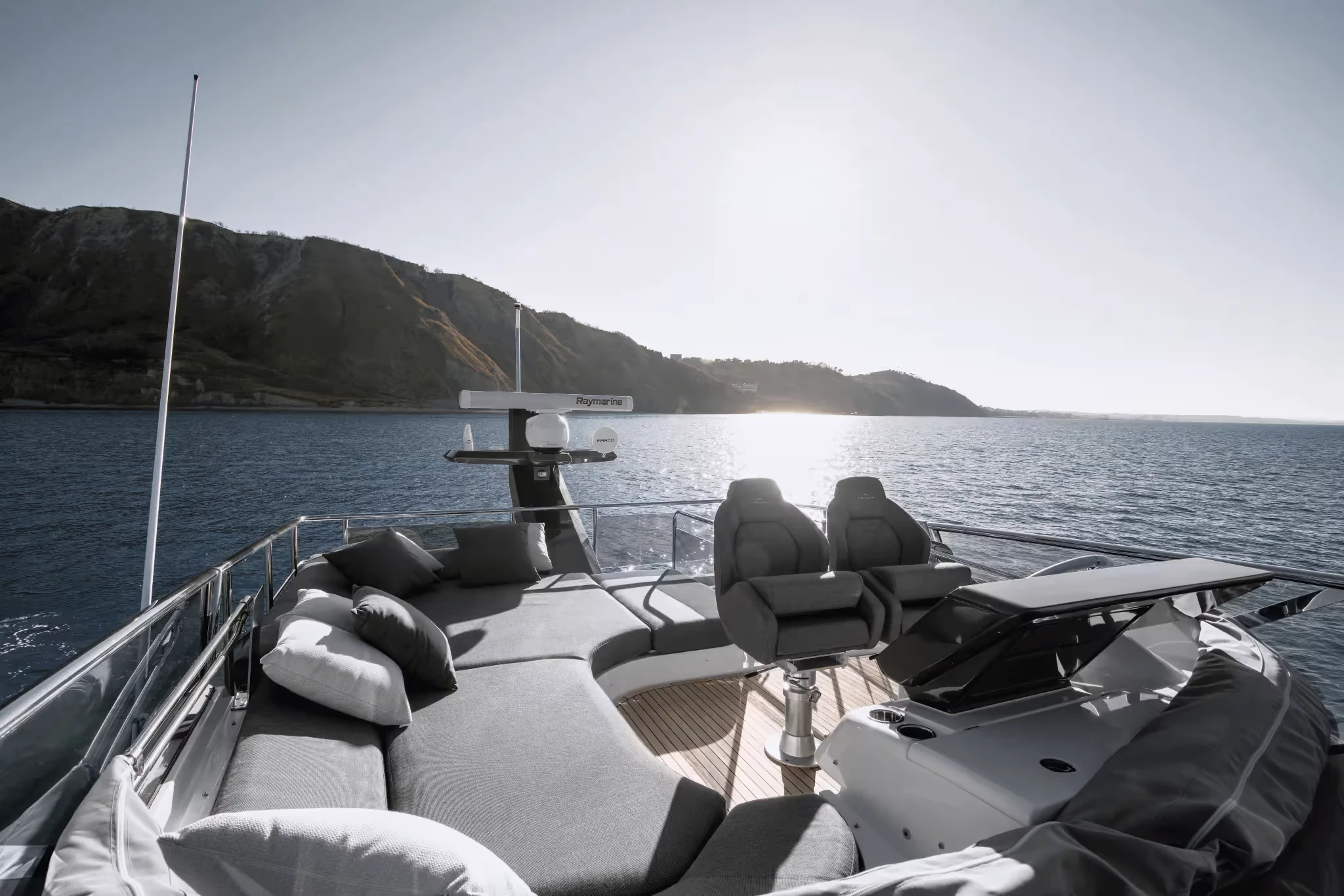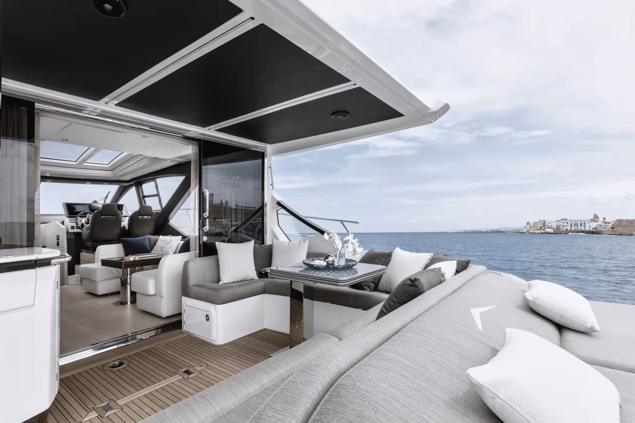 El plano de la plataforma respalda tanto el entretenimiento como la utilidad.. La versión estándar con techo rígido incluye amplias áreas de descanso y comedor en la cabina; la variante Sportfly agrega una segunda estación de mando en el techo y más espacio para sol o sombra, Se accede a través de una escalera retráctil.. Un garaje auxiliar y una plataforma de baño hidráulica amplían el espacio funcional para el acceso al agua y la manipulación de juguetes..