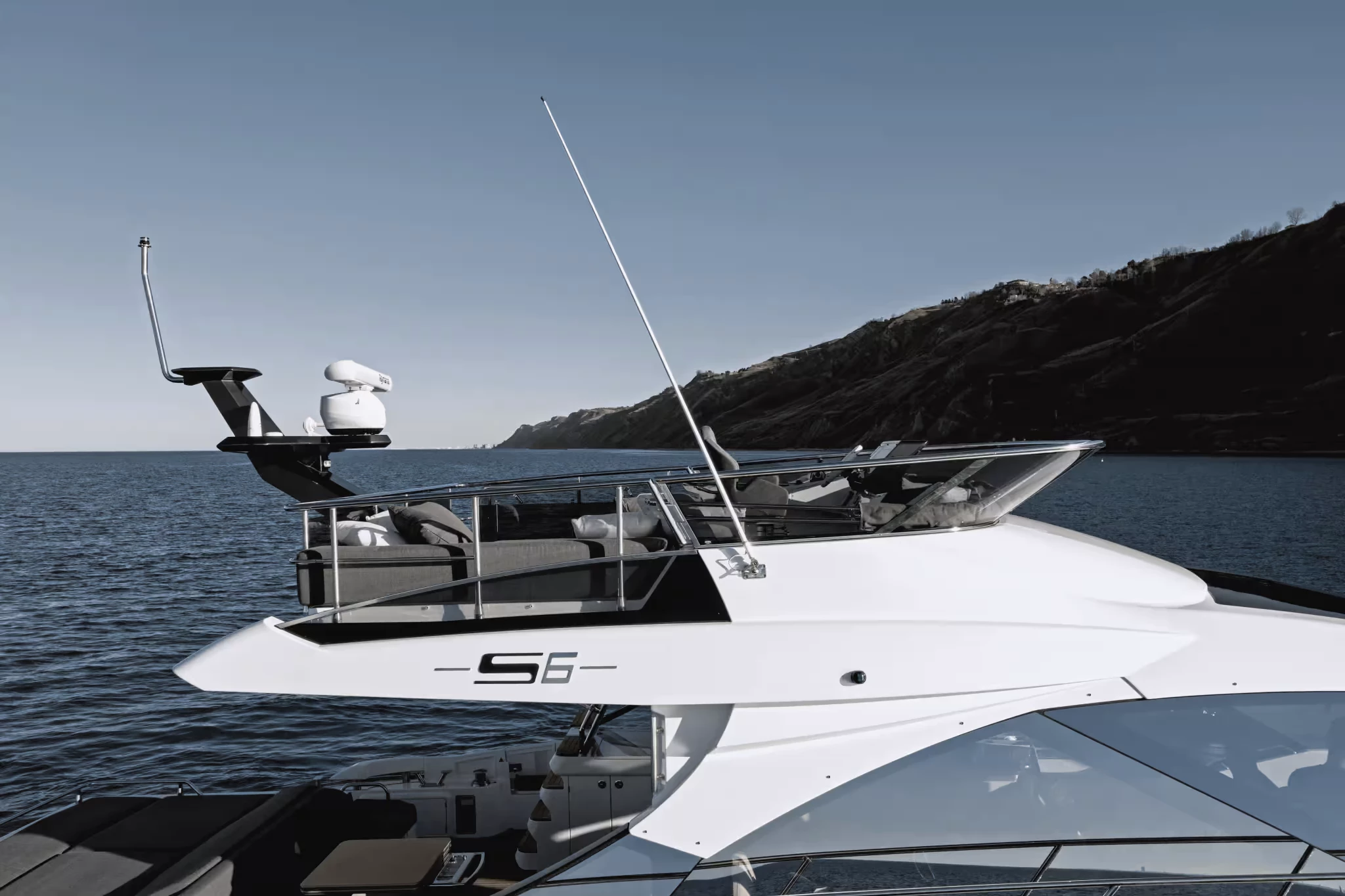 Combinando tres Volvo Penta IPS 700 motores (cada 550 hp) con un casco con forma de flujo de agua eficiente y un uso significativo de la fibra de carbono en sus estructuras superiores, El S6 minimiza el peso por encima de la línea de agua y reduce el rollo.