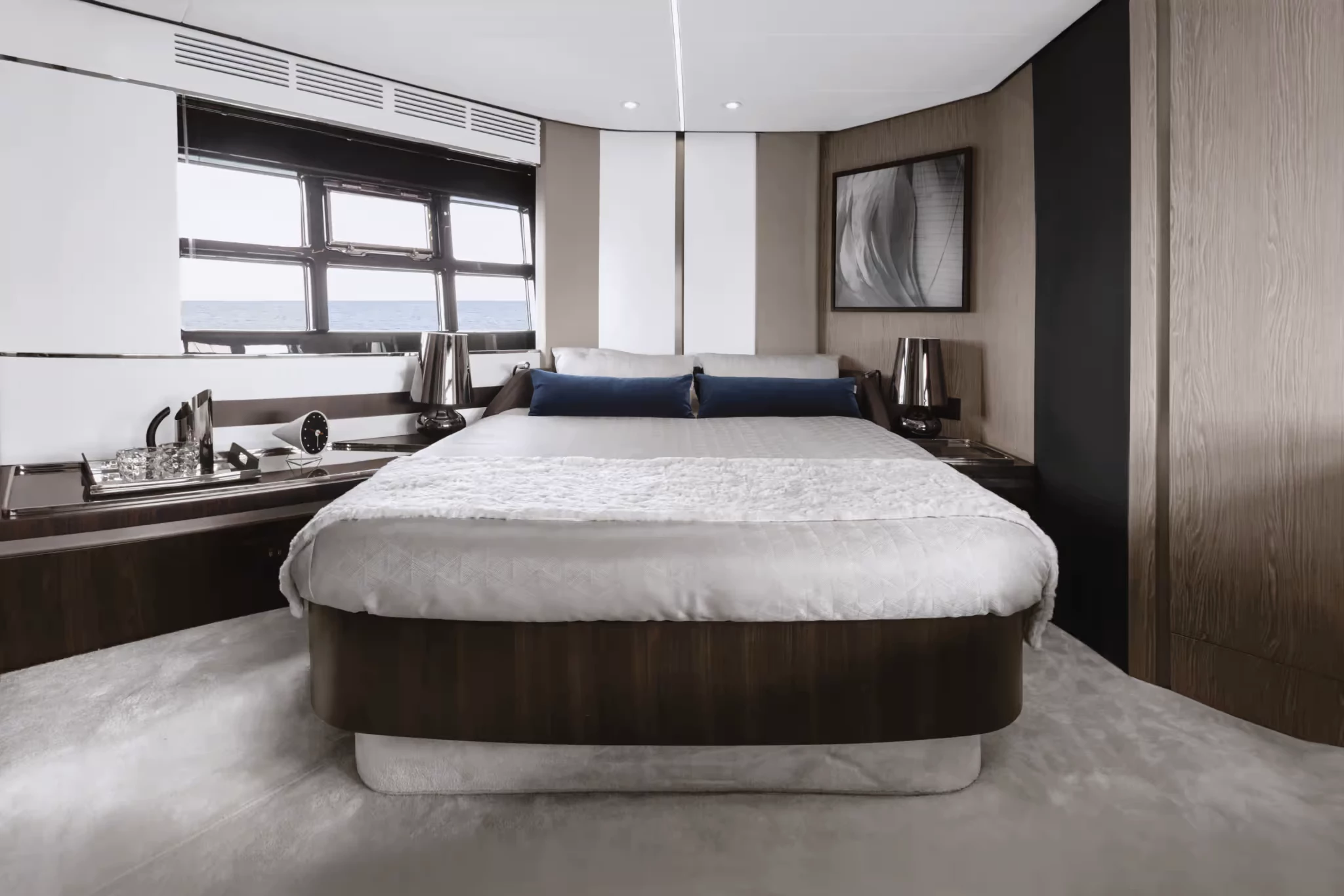 Adentro, el S6 equilibra espacio y función. Su distribución incluye tres camarotes para invitados más un camarote para la tripulación., con capacidad para seis huéspedes cómodamente. Dos baños completos dan servicio a los huéspedes., y hay un jefe de equipo dedicado. La luz natural procedente de las amplias ventanas del casco y la cuidadosa selección de materiales contribuyen a una sensación de apertura sin comprometer la integridad estructural o el rendimiento..